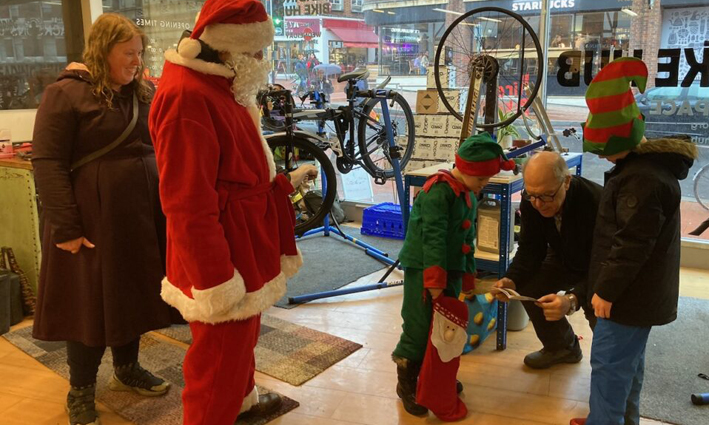 After the ride the elf enjoyed giving out copies of this year’s Kidical Mass Christmas book to the mechanics and visitors at the bike hub where we ended the ride.
